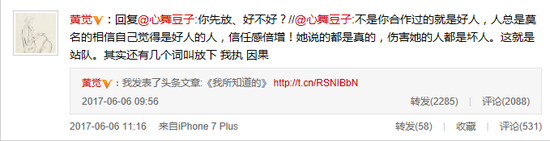 6月5日,黄觉微博发文《我所知道的》,就印小天当年疑似对边潇潇片场动粗一事,表明自己力挺边潇潇的态度。随后,不少网友回击黄觉观点,黄觉也立马针锋相对怒怼网友,“至少比你们这些在下面评论的人更了解真相”。