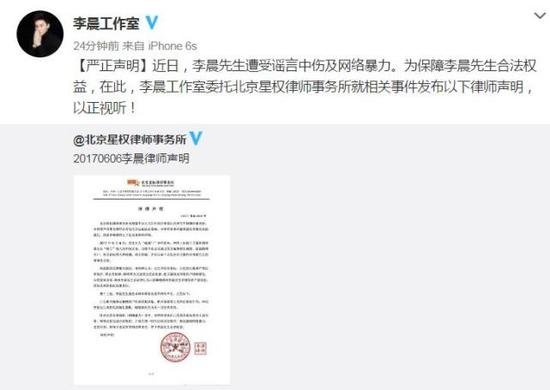 6日,李晨发表声明,斥网络言论不实,表示要依法抵制网络暴力,捍卫合法权益。