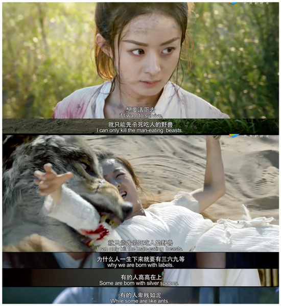 一开场,就是赵丽颖与狼群厮杀的戏份,身为女奴出身的她与一群女孩子被送到猎场,成为王权贵族猎杀游戏的对象,赵丽颖为了救自己与妹妹拼尽全力逃亡、甚至徒手与狼搏斗、被狼咬得鲜血直流。