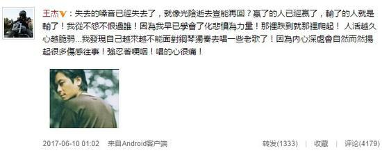 节目播出不久,王杰10日凌晨1点多在微博发文,感叹已经失去原有的嗓音(在香港被人在饮料中下毒,导致嗓子被毒哑),“我从不怨不恨过谁!那里跌到就那里爬起!”只不过年纪越大,内心就越发脆弱,“发现自己越来越不能面对钢琴独奏去唱一些老歌了”,会不自觉地想起伤感往事,“唱的心很痛!我真是太没用了…。”