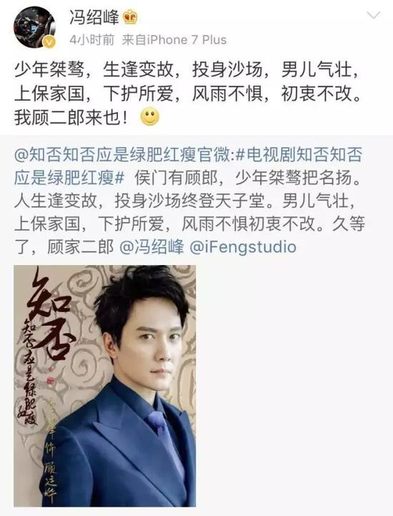 继《西游记女儿国》之后,冯绍峰赵丽颖将迎来再一次合作,《知否知否应是绿肥红瘦》半个月前官宣女主赵丽颖,今天官宣的男主角顾廷烨,由冯绍峰饰演。