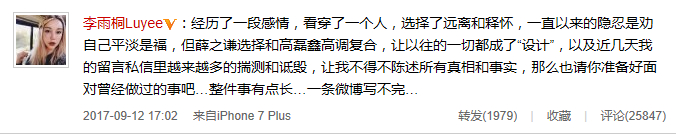 她的好友湾湾还爆料李雨桐在薛之谦不火的时候养了她三年。另一个好友铁柱也爆料,高磊鑫跟薛离婚时,高要1000分手费,见薛同意,又涨价到两千万。而他们离婚后,薛就跟李雨桐在一起了,后来薛红了又出轨跟前妻好上,然后就美名其曰说为了真爱两人就复合。