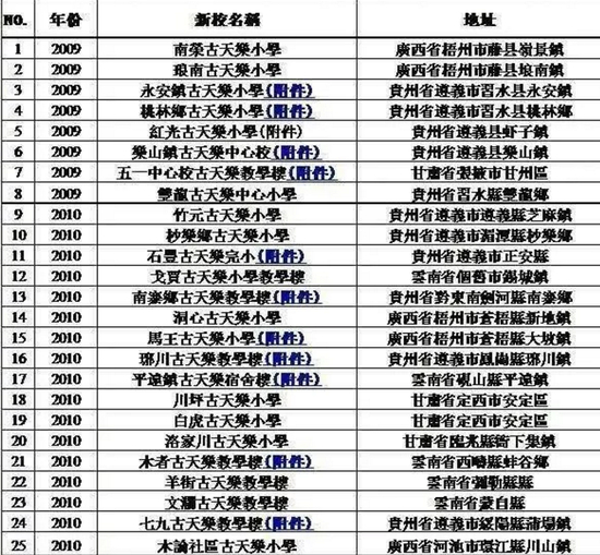 从名单上看,第一座古天乐小学建于2009年,位于广西壮族自治区藤县岭景镇,此后数座古天乐小学相继在广西、贵州、云南、甘肃、四川等地建起。曾有网友表示:“截至2014年5月,古天乐先生内地捐建学校63所,今年新增‘古天乐第62教学楼’位于贵州省黔南州荔波县方村乡,‘古天乐第63教学楼’位于云南省文山州德厚镇亚拉冲村。”这个数字到2016年已经更新到了86。