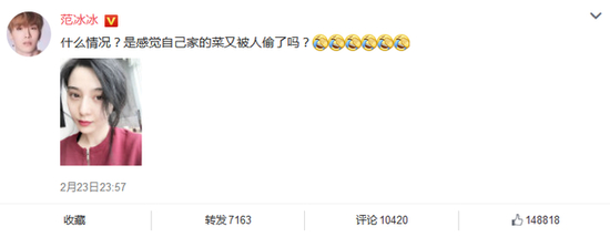 范冰冰当晚发博,表示“什么情况?是感觉自己家的菜又被人偷了吗?”并配上捂脸有趣表情。