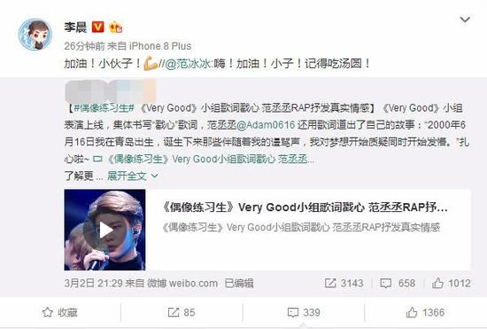 而范冰冰则在3日以微博转发了范丞丞参赛《偶像练习生》的视频,并喊话弟弟:“嗨!加油!小子!记得吃汤圆! ”