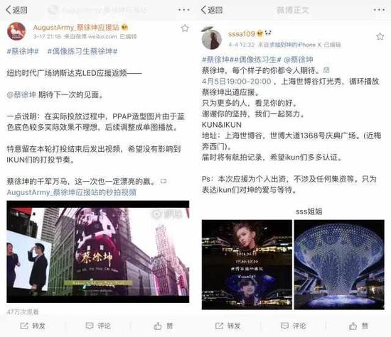 另外,在比赛期间所有对外开放的见面会、决赛中,粉丝们的应援也和已出道艺人旗鼓相当,地铁灯箱广告、商业中心LED屏投放、花墙、易拉宝、应援车、灯牌手幅,该有的样样不少。蔡徐坤个站和粉丝甚至自费在纽约时代广场、上海世博谷投放偶像宣传片。