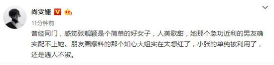 而尚雯婕11日突然发声,称:“曾经同门,感觉张靓颖是个简单的好女子,人美歌甜,她那个急功近利的男友确实配不上她。朋友圈爆料的那个知心大姐实在太想红了,小张的单纯被利用了,还是遇人不淑。 ”疑似评论张靓颖冯轲被传分手事件。