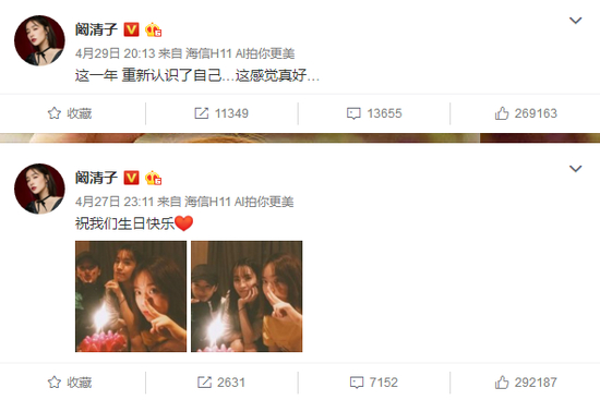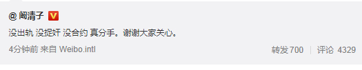 阚清子在微博发文说“没出轨、没捉奸、没合约、真分手,谢谢大家关心”,当然之前那句更深入人心——“我的青春喂了狗”。