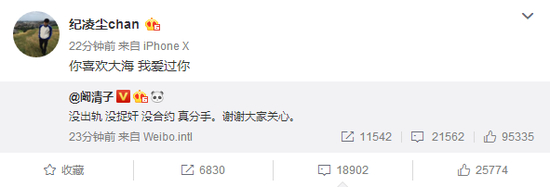 而后面一条微博简直是声明中的典范了,总共18个字——“没出轨、没捉奸、没合约、真分手,谢谢大家关心。”干净利落,没一个字废话,还帮前任保持了最后的体面。