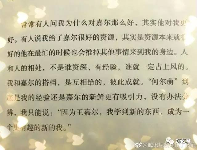 能够这样频频得到和何老师一起合作的机会,慢慢也让越来越多的人开始不解,为什么何炅会给王嘉尔这么多好的资源。而最近何老师也对这个疑惑给出了答案——其实他对我更好。人和人的相处,不是谁资深、有经验,谁就一定占上风的。我和嘉尔的搭档,是互相给的,彼此成就。
