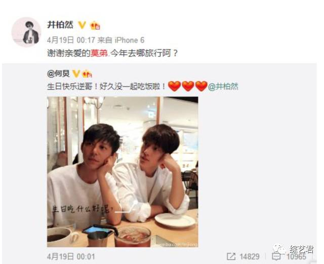 早在井柏然的新人时期,两个人就开始在微博上互动频繁,何老师还很义气的为小井的电影《等风来》站台,而井柏然也会经常在微博上帮何老师的作品进行宣传。井柏然也曾经说过,何老师是自己在娱乐圈最好的朋友之一。