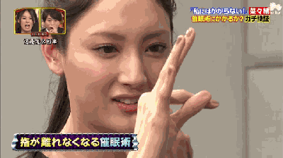 首先上场的选手是身高172腿长85的大美女菜菜绪,她被施加的催眠是大拇指和食指无法分开。