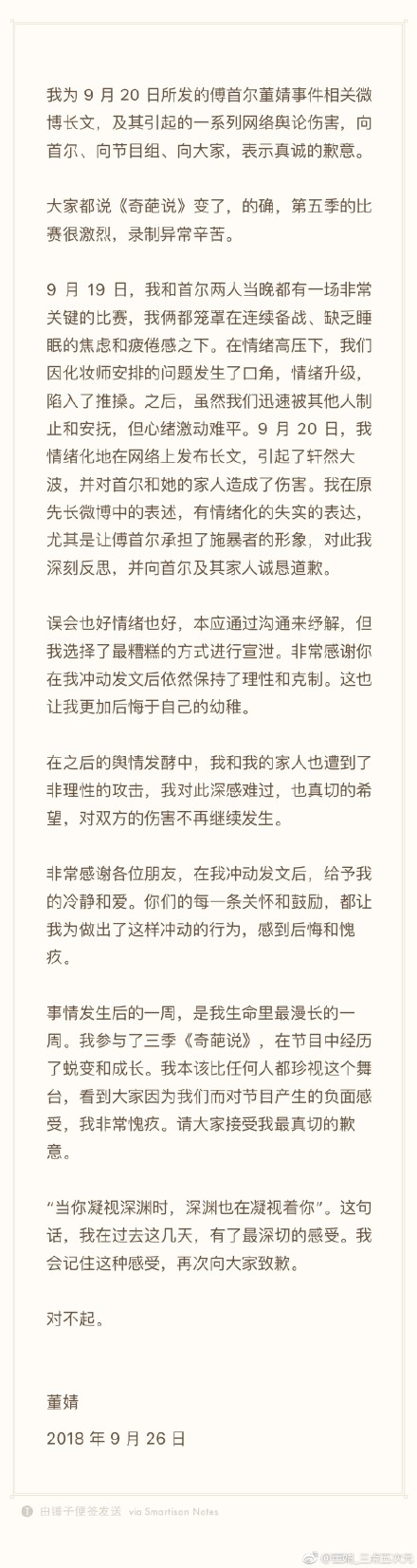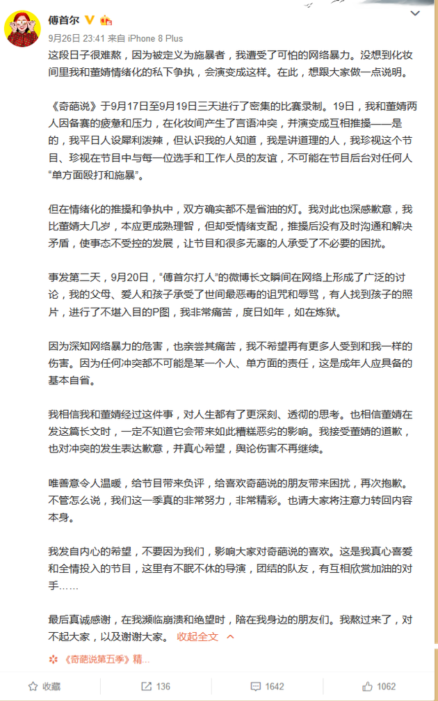 随后董婧发长文道歉,称在20日发布的内容中有情绪化的失实的表达,让傅首尔担任了施暴者的形象,对此很抱歉,很后悔选择了最糟糕的方式来宣泄情绪,因此事件让大众对节目产生负面认知表示很愧疚,感谢粉丝在自己冲动后给予的爱和支持,希望对双方的伤害不再发生。