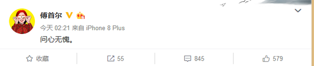 凌晨2:21,傅首尔再次微博发文称“问心无愧”,疑似回应和董婧的打骂事件。