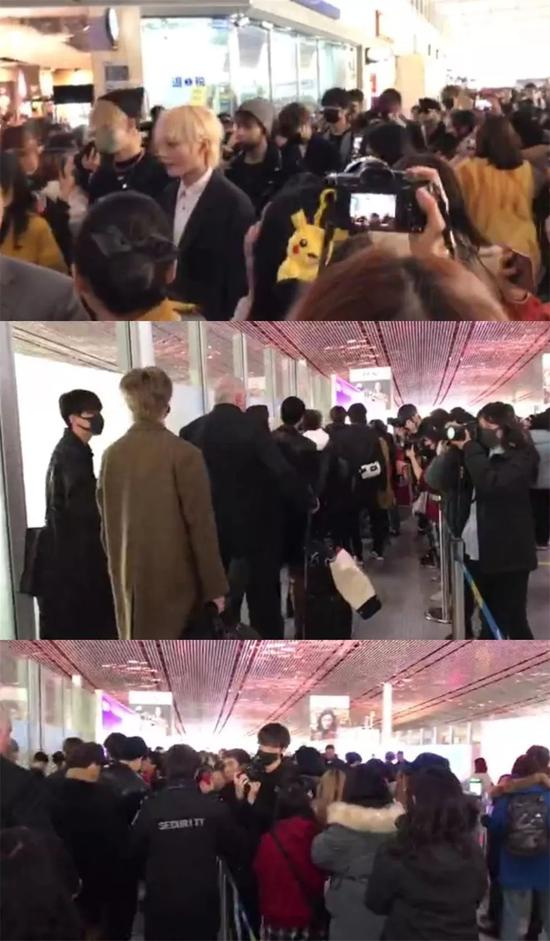 R1SE11个人在机场里很显眼,列队刚走来,就被几十位站姐围住怼着脸拍。