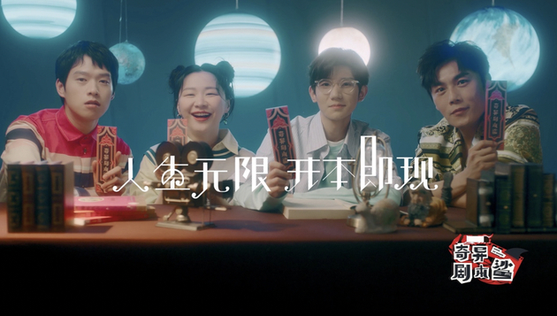 接着宣传片更加直观地展示了剧本杀里丰富多彩的幻想世界。先是由王源翻动剧本查看角色,和三位成员共同开启了剧本杀游戏。在剧本杀世界里,秦昊率先变身,饰演摇滚歌手挥动双手,魏大勋接着现身,身穿民国装身形流畅舞起扇子,金靖紧随其后,特工身份难掩眉眼间的严肃,最后出场的王源手中“有内鬼,终止交易”的提醒似乎提示了观众他的身份并不简单……经过线索展示,他们最终锁定了真正的凶手。“看过嘉宾演戏但没看过嘉宾同桌竞技。”四位成员对角色的演绎氛围感十足,集体飙戏让观众大呼过瘾,也让观众对于正片里成员们的互动体验充满着想象空间。
